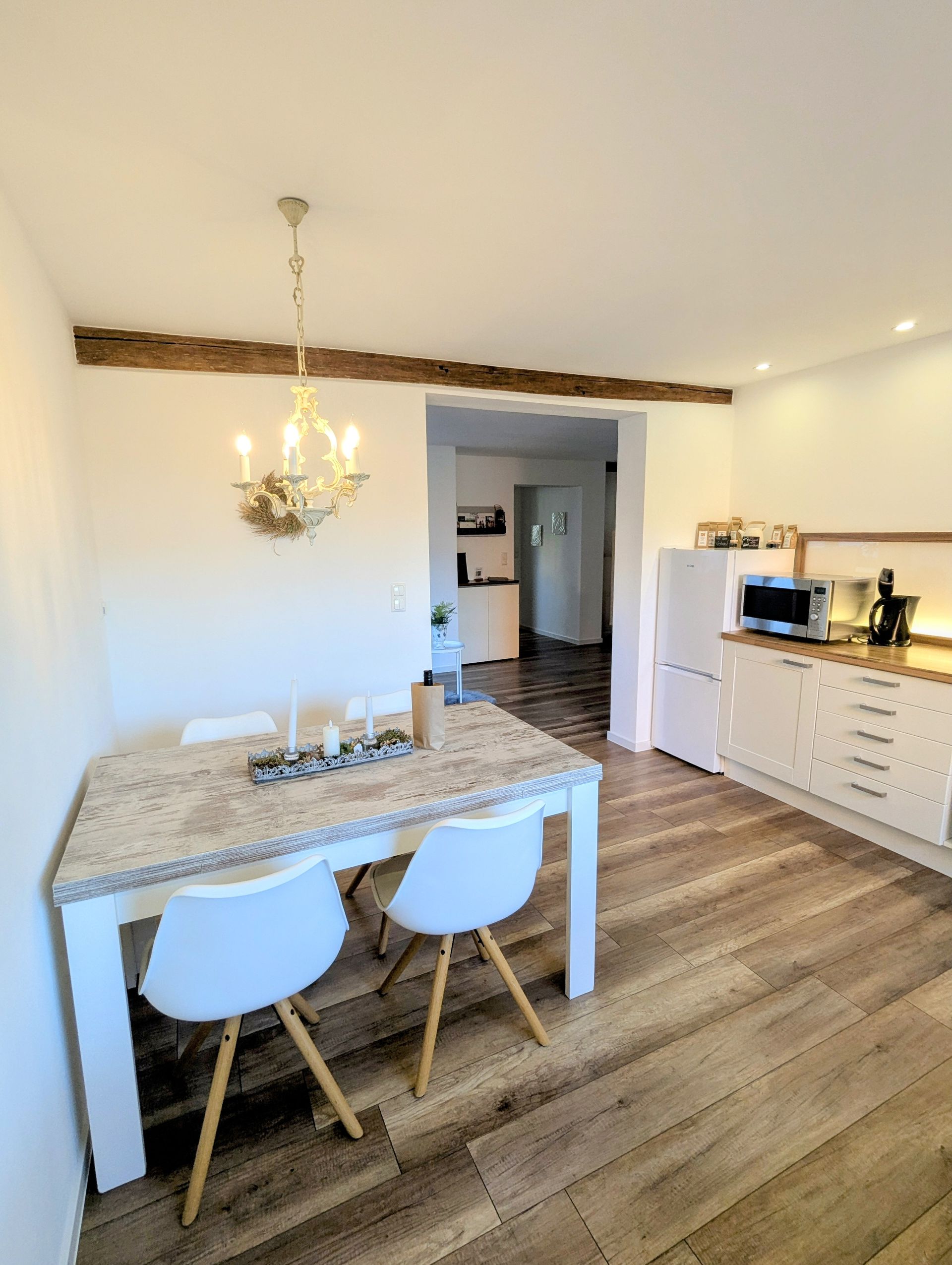 El dormitorio está amueblado con una cama de 160x200 cm. Se proporciona ropa de cama abundante. También hay un armario abierto para colgar la ropa y cómodas adicionales. El salón cuenta con un sofá cama extensible a 140x190 cm. Puede ponerse cómodo frente al televisor tanto en el salón como en el dormitorio. La espaciosa cocina-comedor de concepto abierto está amueblada con mesa y sillas. La cocina está equipada con vajilla, ollas y sartenes, frigorífico/congelador, microondas, hervidor de agua, tostadora, horno con vitrocerámica, cafetera y un lavavajillas grande. La cocina está totalmente equipada con todo lo necesario, como especias, hierbas aromáticas, aceite y vinagre, azúcar, cápsulas de café, té, lavavajillas y productos de limpieza. El espacioso baño con ventana está equipado con ducha, lavabo doble, secador de pelo, jabón, lavadora, detergente, papel higiénico, toallas y perchero.